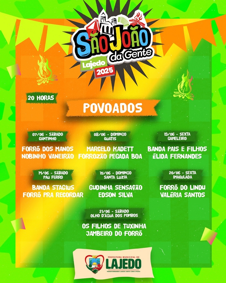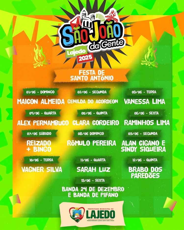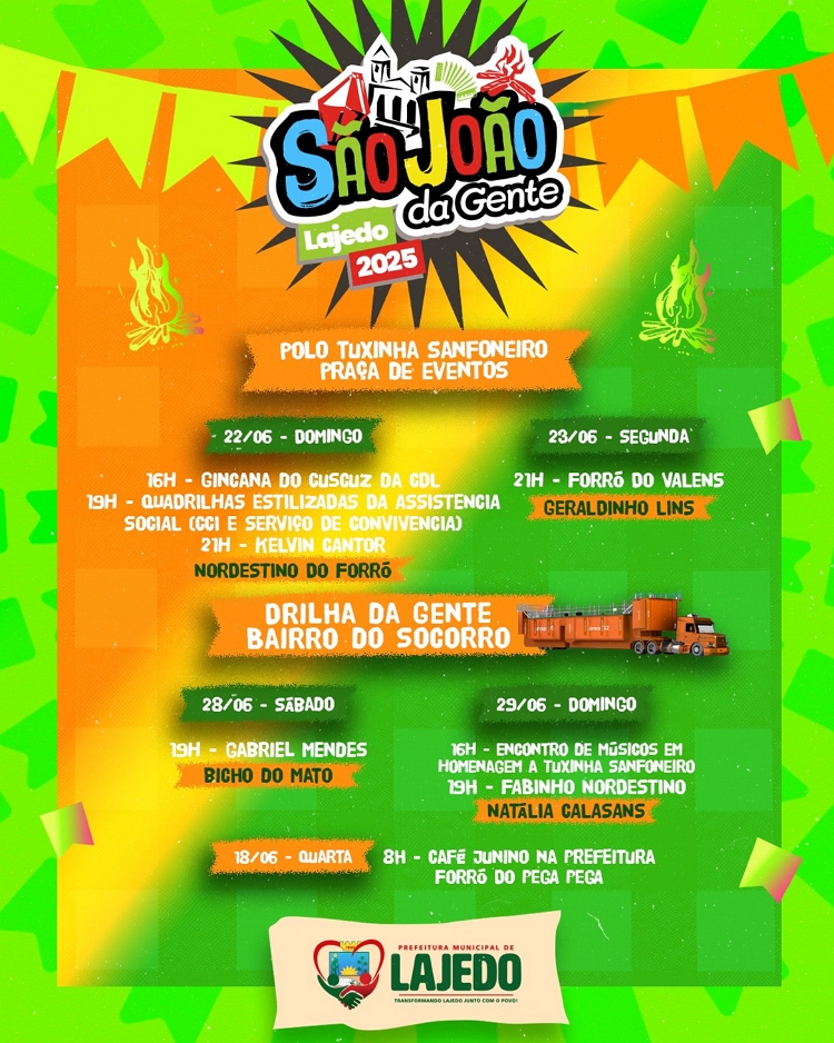 Durante todo o mês de junho, o município de Lajedo realiza o “São João da Gente”, evento que fortalece a tradição dos festejos juninos com uma programação descentralizada e foco na valorização cultural. Neste ano, a Festa presta uma homenagem especial ao Sanfoneiro Tuxinha, artista que faleceu recentemente e marcou a história do forró na Região.