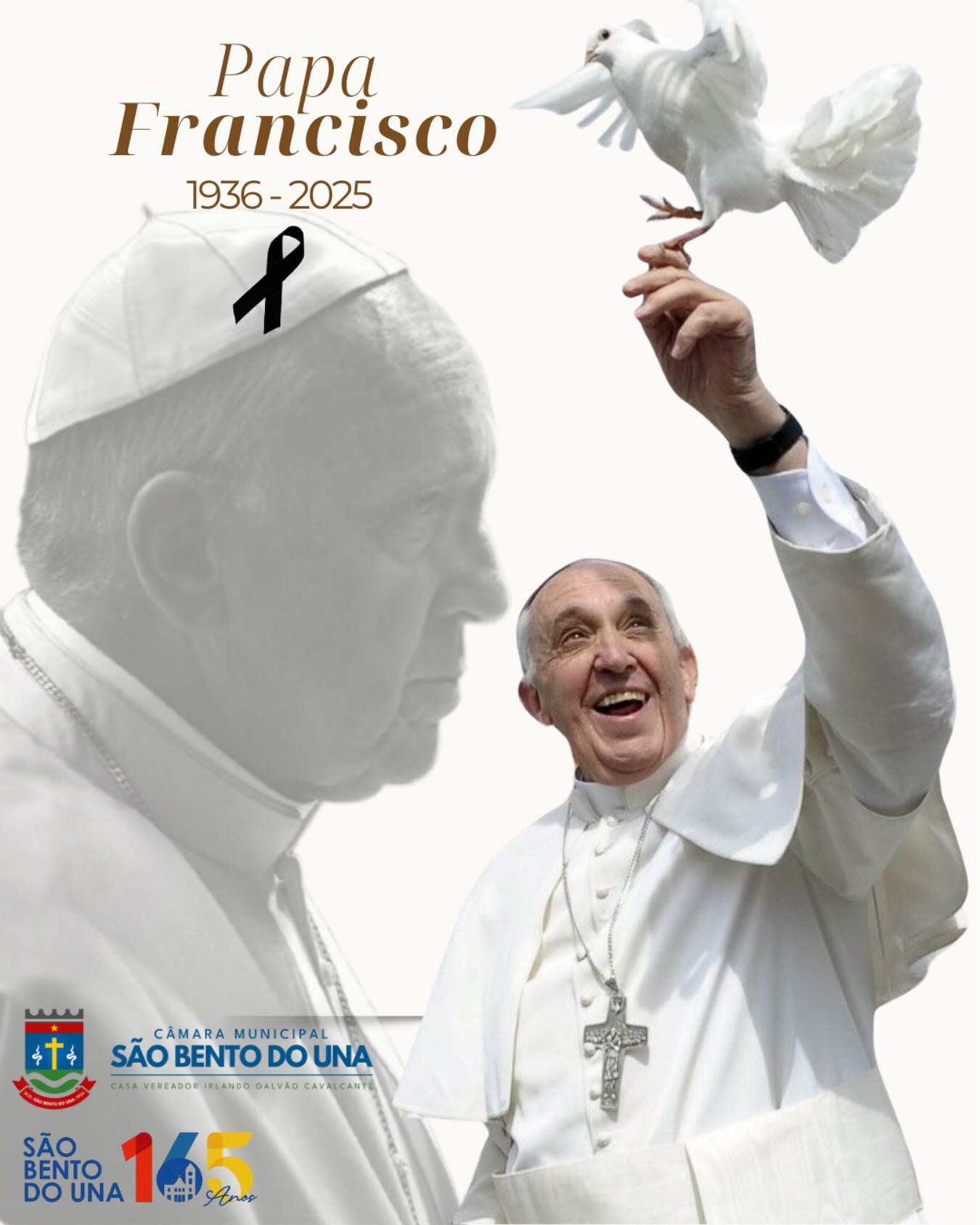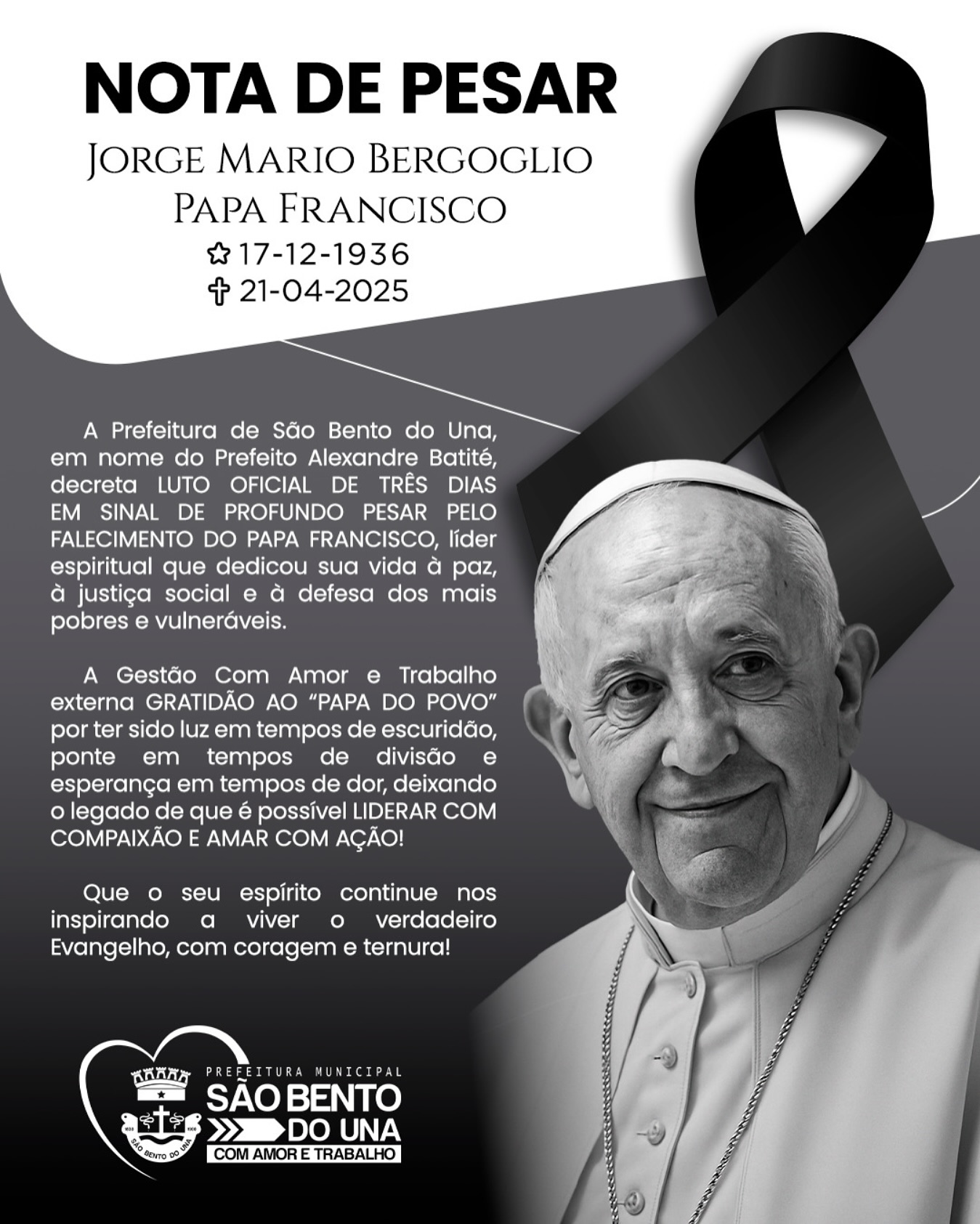 A Prefeitura de São Bento do Una, em nome do prefeito Alexandre Batité, e a Câmara Municipal emitiram, nesta segunda-feira (21), notas oficiais de pesar pelo falecimento do Papa Francisco, aos 88 anos. Em sinal de luto, foi decretado feriado oficial de três dias no município. As bandeiras nas repartições públicas municipais permanecerão a meio mastro, em respeito à memória do pontífice.